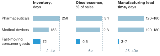 The good news is that models do exist to strengthen and improve the health-care supply chain. We believe that by learning from the experience of industries such as fast-moving consumer goods (FMCG), the health-care sector could cut production lead times and obsolescence, while manufacturers, distributors, hospitals, and pharmacies could carry significantly smaller inventories (Exhibit 1). Improving the health-care supply chain also could give millions of people around the world access to safer and more affordable health care, reduce costs, and provide new revenue sources for manufacturers.