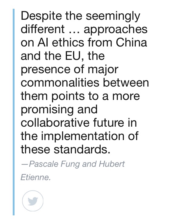 Despite the seemingly different … approaches on AI ethics from China and the EU, the presence of major commonalities between them points to a more promising and collaborative future in the implementation of these standards.—Pascale Fung and Hubert Etienne.