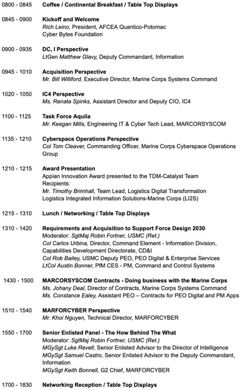 Check out the JAM PACKED AGENDA and Click the link below for more info and to register! You don’t want to miss this spectacular lineup! Confirmed speakers from Marine Corps Systems Command, DON PEO Digital, U.S. Marine Corps Forces Cyberspace Command (MARFORCYBER), and many others!