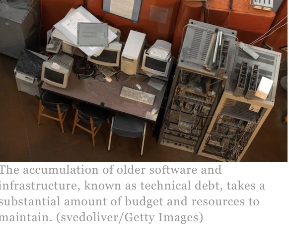 This accumulation of older software and infrastructure, known as technical debt, takes a substantial amount of budget and resources to maintain, which puts pressure on new innovation required for enterprise functions such as cybersecurity.