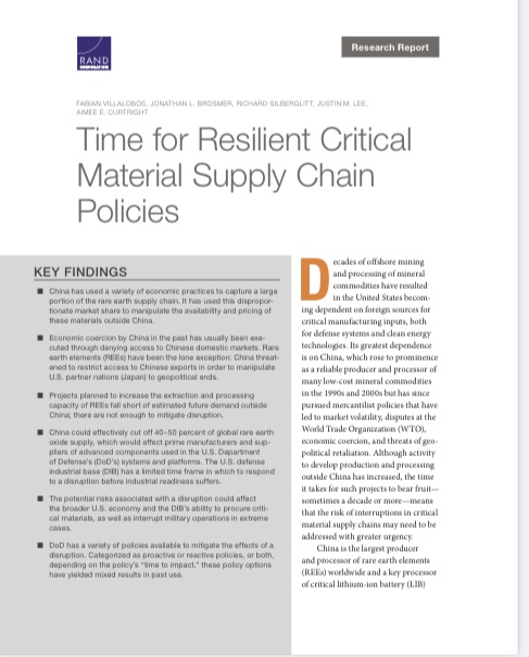 Although a deliberate disruption is unlikely, resilience against supply disruption and building domestic competitiveness are important. The authors discuss plausible REO disruption scenarios and their hazards and synthesize insights from a “Day After . . .” exercise and structured interviews with stakeholders to identify available policy options for DoD and the U.S. government to prevent or mitigate the effects of supply disruptions on the defense industrial base (DIB) and broader U.S. economy. They explore these policies’ applicability to another critical material supply chain — LIB materials — and make recommendations for policy goals.