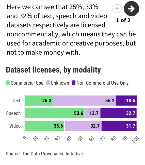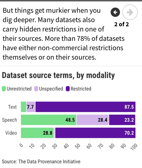They also probably don’t have complete information about any constraints on how that data is supposed to be used or shared. The researchers at the Data Provenance Initiative found that data sets often have restrictive licenses or terms attached to them, which should limit their use for commercial purposes, for example.