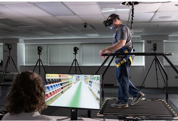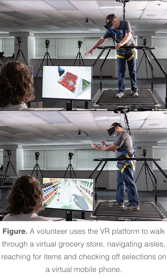 The first virtual environment they developed was the Cleveland Clinic Virtual Grocery Store Task, in which a subject wearing a VR headset walks on the treadmill to navigate through a virtual grocery store. Importantly, subjects are able to walk down aisles as they would in a real store, doing everything from straight-line walking to making turns to turning directions as they reach for items on their shopping list (see video and figure below).